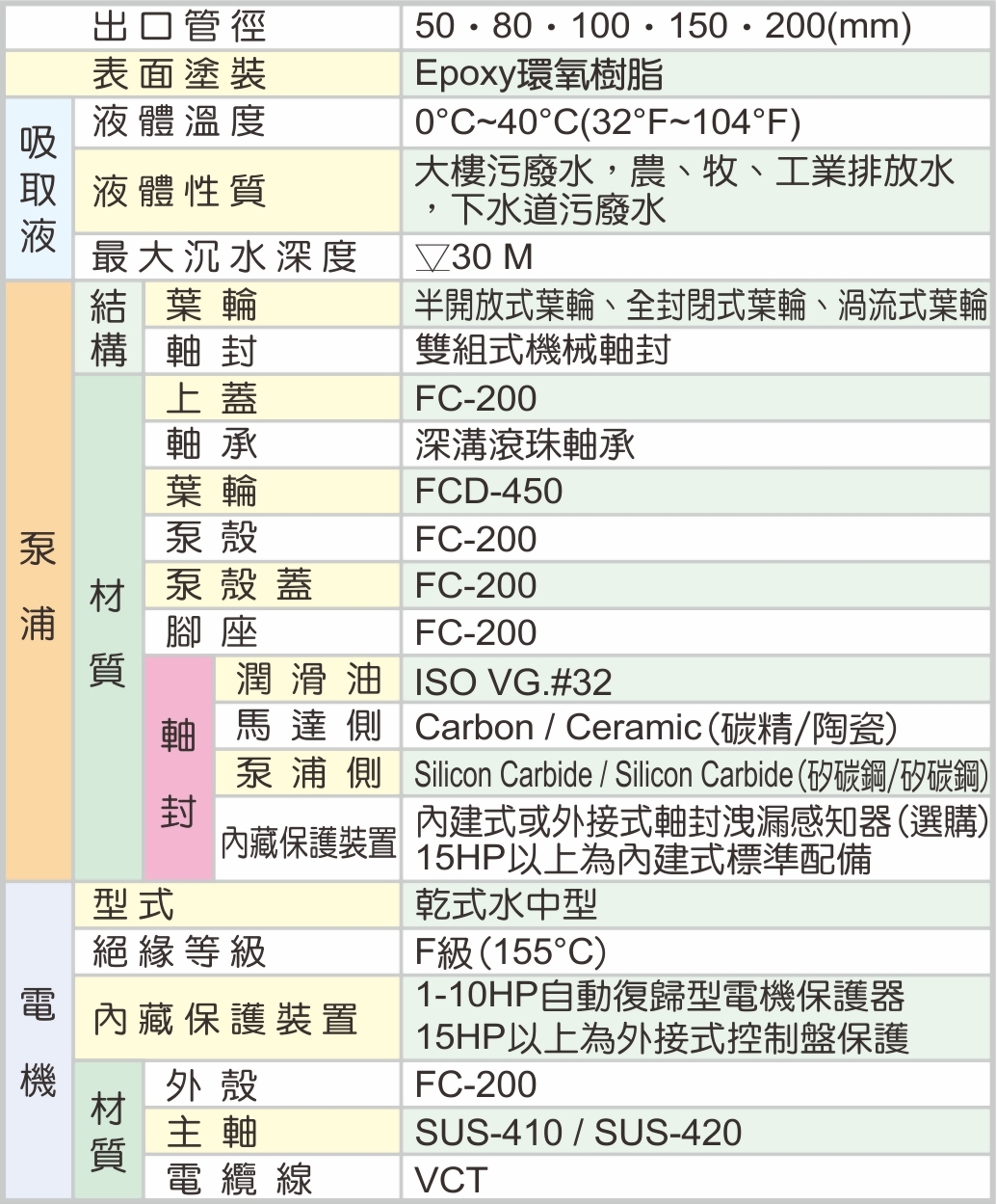 葉輪分別有半開放式(P、S)、全封閉式(C)及渦流式(N)等三種葉輪,可供選擇,適當的搭配選擇能夠妥善處理各類型污物廢水之排放問題。